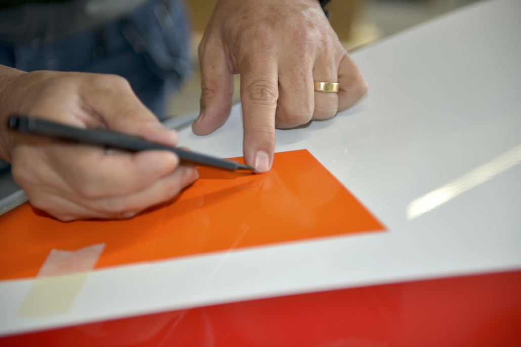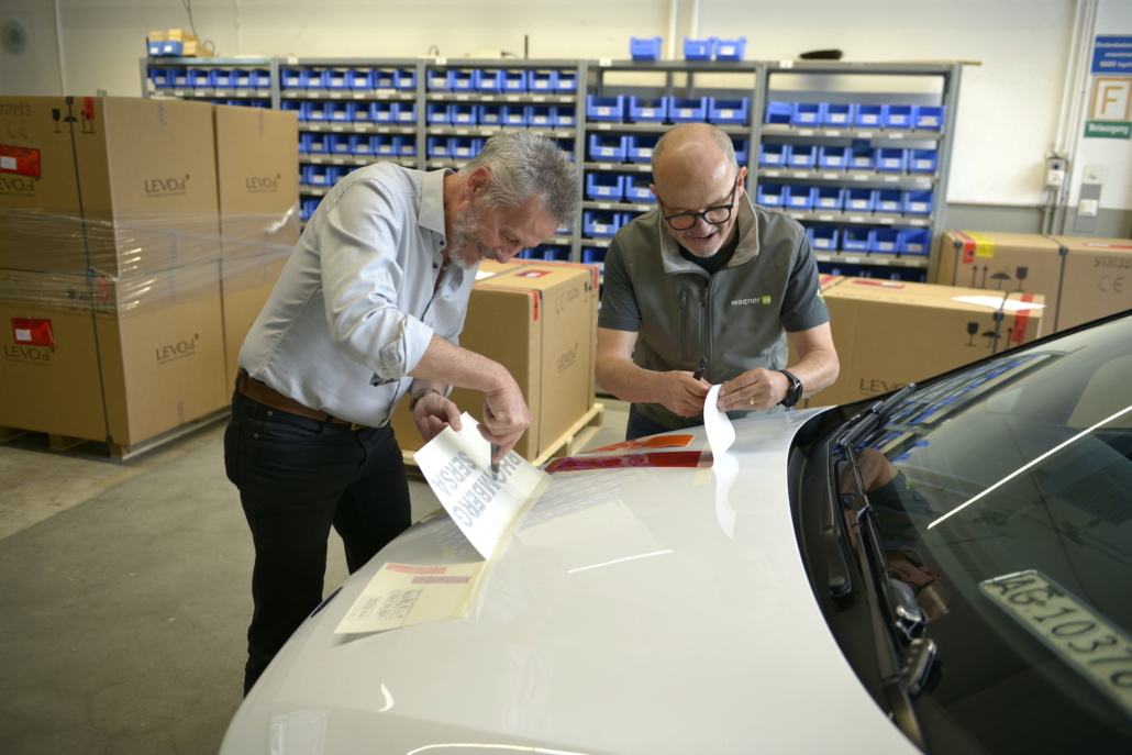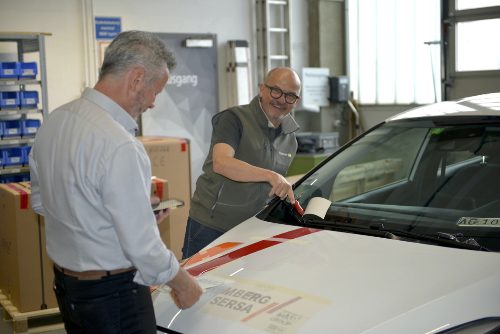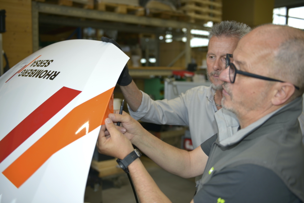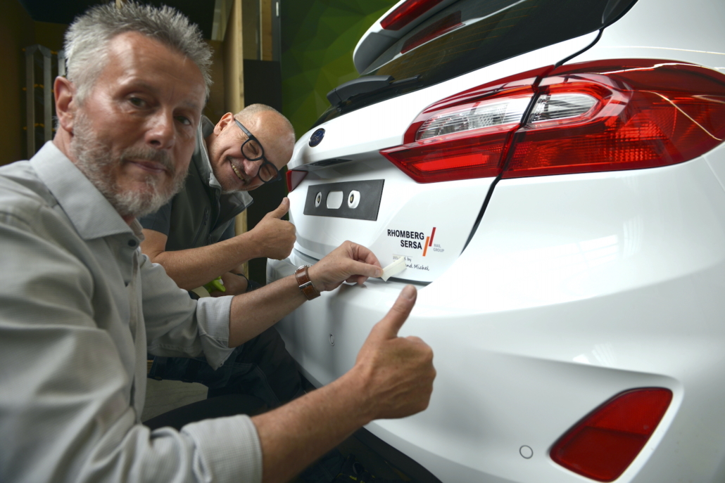 Dieses besondere Ereignis nahm Michel Wagner persönlich in die Hand. Wie vor 30 Jahren, als er das erste Fahrzeug für die damalige Benkler AG beschriftete, übernahm er auch diesmal die Beschriftung des neuen Fahrzeugs. An seiner Seite war René Frey von Rhomberg Sersa Rail Group, der ebenfalls bei der ersten Fahrzeugbeschriftung vor drei Jahrzehnten dabei war. Gemeinsam stellten sie sicher, dass ihre Handwerkskunst immer noch auf höchstem Niveau ist – und das mit einem Augenzwinkern – Mal schauen, ob sie ihr Handwerk auch heute noch beherrschen ;-)